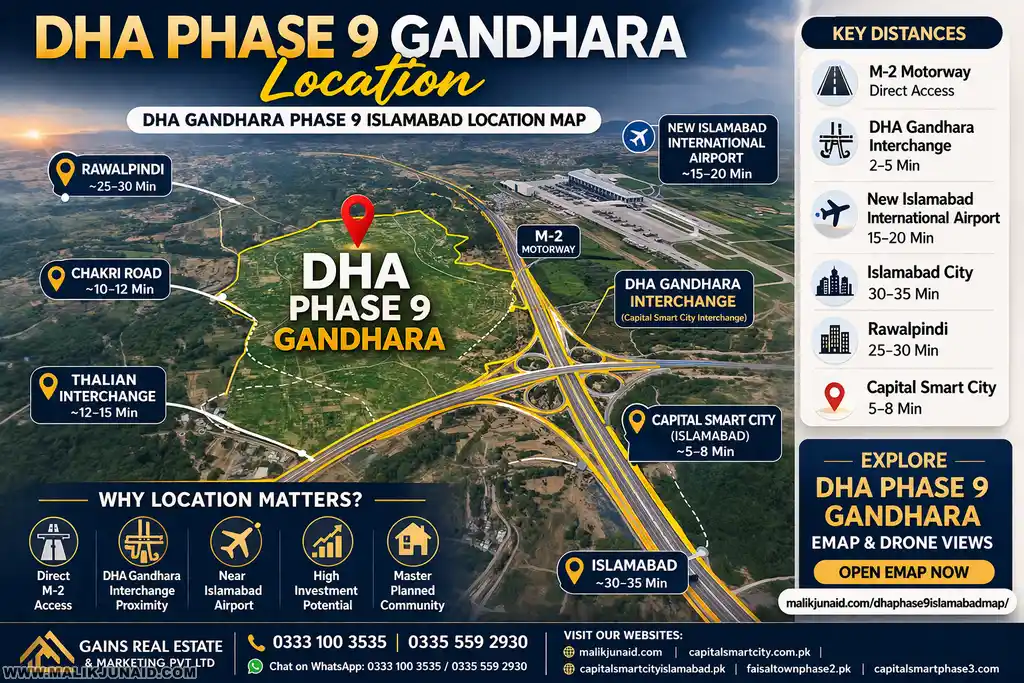 The strongest way to explain the dha phase 9 gandhara islamabad location is this: the project is associated with the M-2 Motorway belt, near the airport-side growth corridor, and in a zone that gains importance from the DHA Gandhara / Capital Smart City Interchange. Capital Smart City’s official interchange page says the interchange is on the M-2 Motorway and directly improves access toward Islamabad, Rawalpindi, and the airport. Third-party search results for DHA Gandhara also repeatedly describe the project as being along the M-2, next to or near Capital Smart City, and close to New Islamabad International Airport.