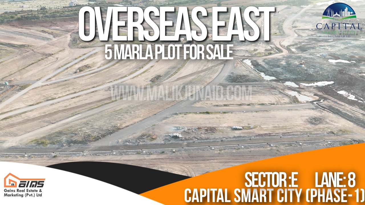 Gains Real Estate and Marketing Pvt Ltd is pleased to present an exceptional real estate opportunity in the heart of Pakistan’s premier smart city. Offering a 5 Marla (125 Sq Yds) residential plot at Plot No. 38-42, Lane No. 08, Sector E, Overseas East, Capital Smart City, this plot is 2160000 paid plot is available now—ready for construction or resale.